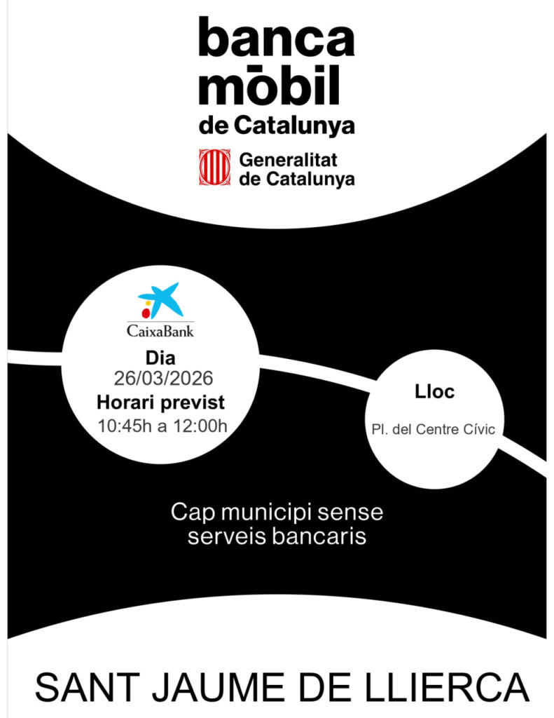 El proper 26 de març, el servei de banca mòbil de Catalunya (CaixaBank) serà al municipi per facilitar les gestions bancàries a la ciutadania.