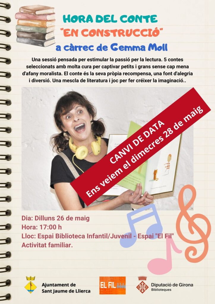 Per motius aliens a l’Ajuntament, l’activitat “Hora del Conte – En construcció” a càrrec de Gemma Moll prevista inicialment per al 26 de maig, es trasllada al: