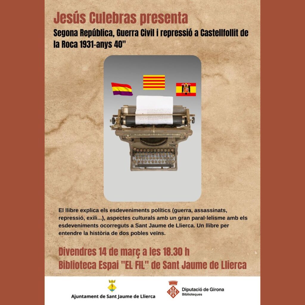 No et perdis la presentació del nou llibre de Jesús Culebras, on descobrirem la història de la Segona República, la Guerra Civil i la repressió a Castellfollit de la Roca, amb un gran paral·lelisme amb els esdeveniments viscuts a Sant Jaume de Llierca.